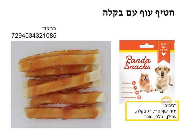 חטיפי פנדה רכים, מזינים ומפנקים. לפינוק הכלב ברמה יומיומית! מקלות עוף ובקלה עם 35% חלבון | חטיפי פנדה רכים לכלבים עשויים מבשר עוף ובקלה משובח, בשר מזין ומתעכל בקלות. חטיף עשיר בסידן, מועיל לשיני ומפרקי חיית מחמד. מוסיף ברק וניצוץ לפרווה.